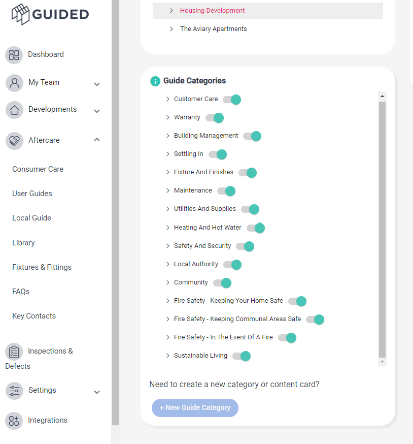 2. Create New User Guides: If you would like to add a new user guide - click on '+New Guide Category' button at the bottom