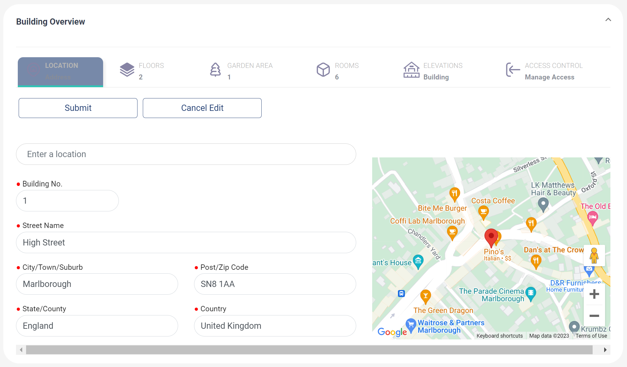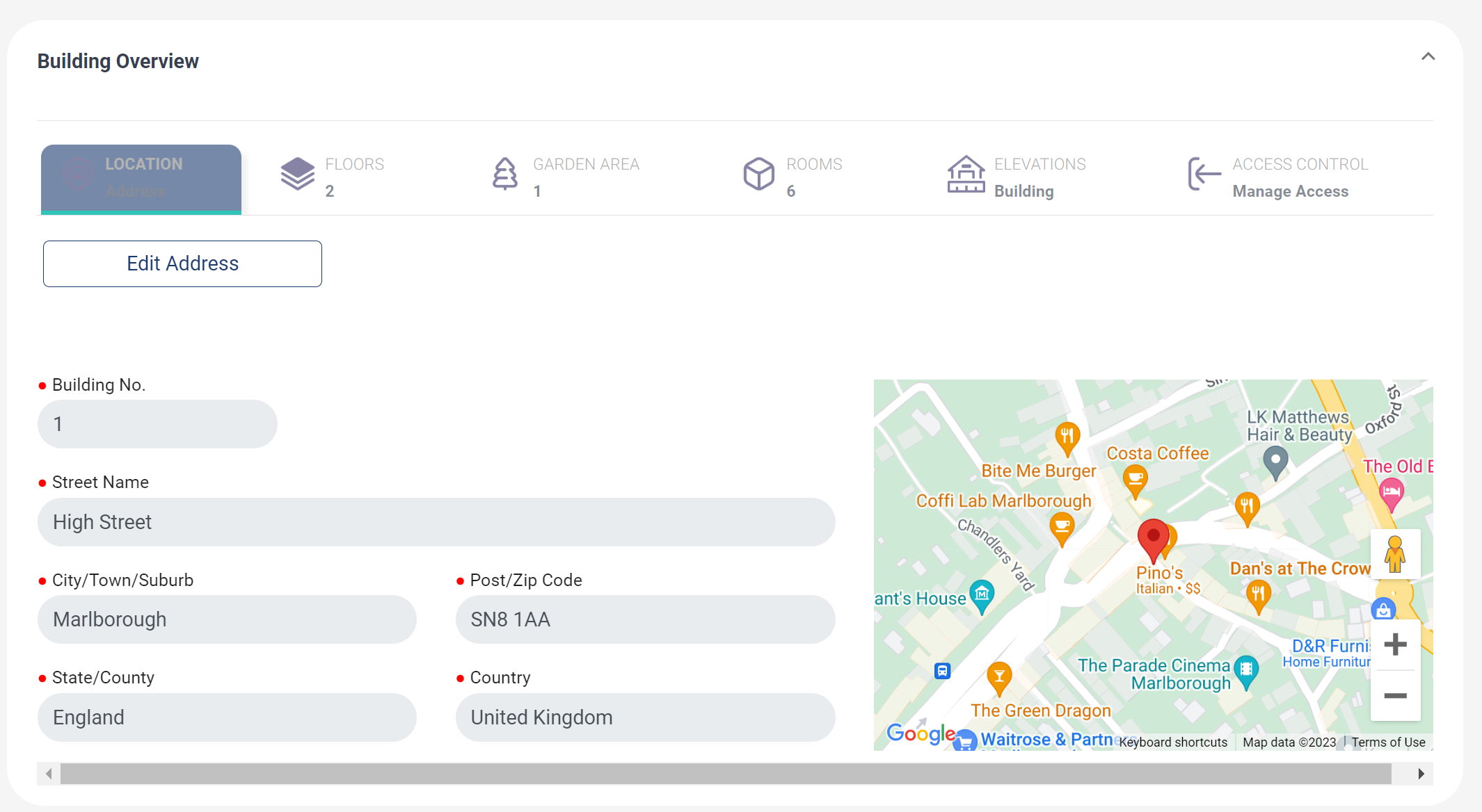 - Expand the Building Overview tab and click on the Edit Address button: